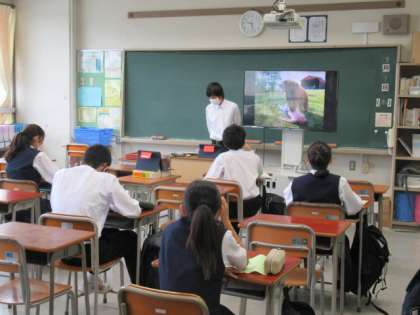 理科の授業では、エネルギーの変化を調べる実験の様子を教室と自宅で伝え合いながら学習していました。同一内容を一緒に取り組む典型的な授業です。英語の授業は画像を見せながらのスピーチを配信し、教室と自宅で仲間の発表を同時に聞ける授業でした。