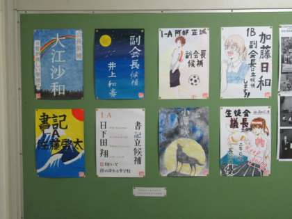16日の立会演説会に向けて、立候補者と応援者が原稿づくりをしています。今日からは、朝の時間に各教室を回り、所信表明です。全候補者のポスターもそろいました。「明日の富士中」のために、各自の猛アピールがまぶしいです!