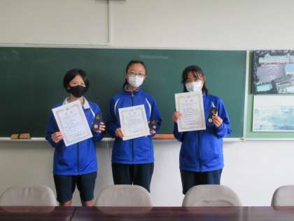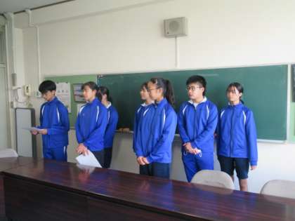 Zoomを利用して生徒会集会を行いました。3年生を中心とした現生徒会役員の任期がまもなく終わります。今朝の集会ではみんなが顔をそろえ、会長が代表してあいさつをしました。楽しい行事を企画・運営したメンバーです。1、2年生が中心となった運動部が成果を収め、今朝はテニス部の表彰をしました。1年生の授業を担当する教職大学院の実習生が来たので、その紹介も行いました。