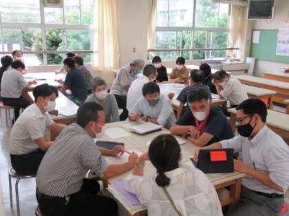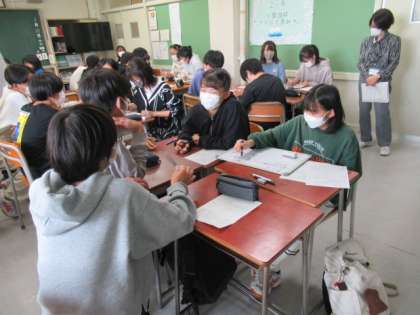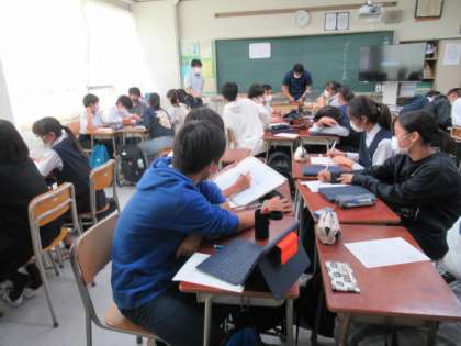 今日は2年生の先生たちの研究授業でした。iPadを使って、話し合い活動を活性化することをめざした授業です。生徒は、働く上で大切にしたいことは何かを考えたり、夢を追える職業と地域のために働く職業の選択に葛藤したりしていました。
