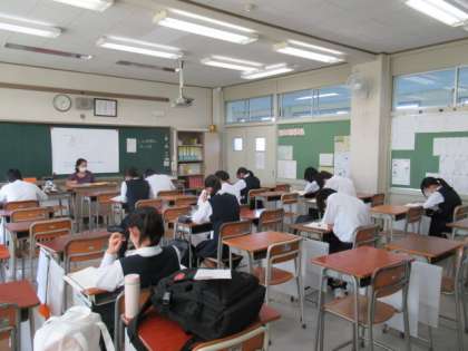 土曜授業日の午前中は、3年生が東京都の英語スピーキングテストのプレテストを受けました。これは、次年度から導入される都立入試の方法を検証するためのものです。午後は6教室に分かれ英検です。1〜3年生の希望者が、めざす級の合格に挑みました。