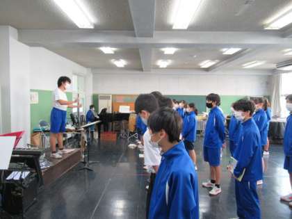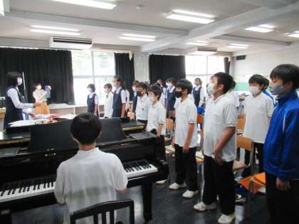 どのクラスも、全体での練習時間が増えていきます。音楽室では各パートのメロディをきれいに調和させようと、1、2年生が練習をしていました。
