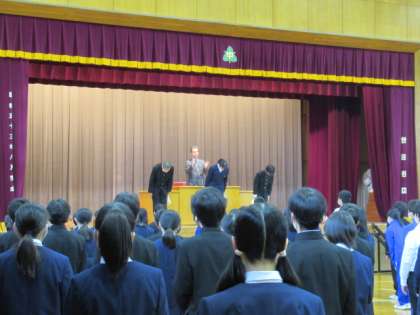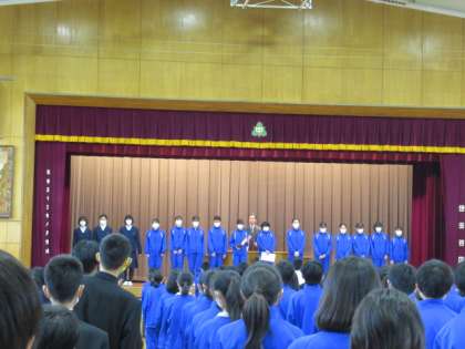 全校朝礼では、人権週間にちなんで、いじめの醜さ、苦しさの話を校長がしました。生徒表彰は1年生の「税の標語」の受賞、女子バスケットボール部の区新人大会3位入賞を表彰しました。