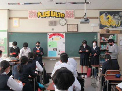 2年生は。10月末に行った鎌倉の班新聞の発表を行いました。訪れた名所の紹介はもちろん、お昼ごはんの食レポも、聞く側の興味を引いていました。「また、行きたいな」と思わせる発表を心がけていました。