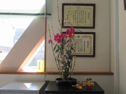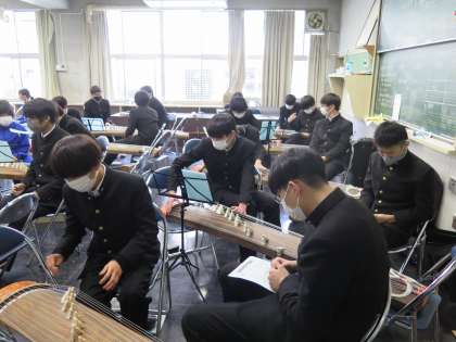 音楽の授業では、箏曲の勉強をしています。琴の調べで、教室はゆったりと落ち着いた雰囲気になります。日本文化部が生けてくれる花は、春の花に変わりました。