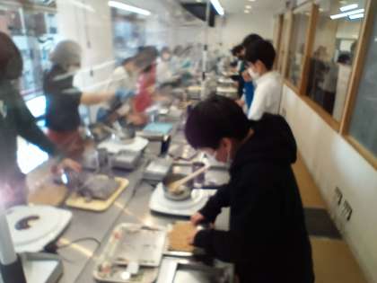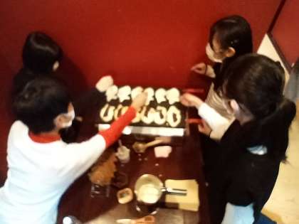 お昼は2か所に分かれて食べました。今回の校外学習は、たい焼きづくりかおこしづくりのいずれかを選んで体験しています。どちらもお家へのお土産です。