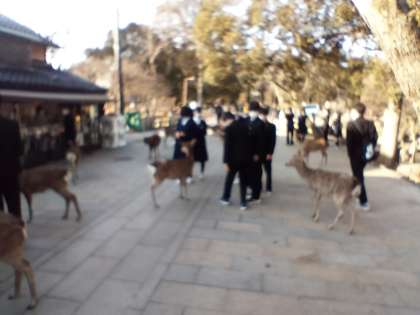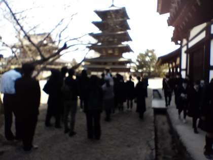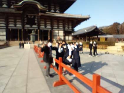 修学旅行初日の午後は奈良の観光です。ガイドさんの案内で法隆寺を見学し、奈良公園は班行動で楽しみました。