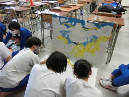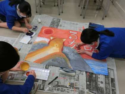 放課後練習のあとは、17時30分まで各教室でクラス模造紙作りをしています。クラスカラーを基調とした作品に仕上げています。当日は、校庭の壁面に貼り、体育大会を盛り上げます。