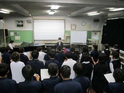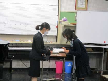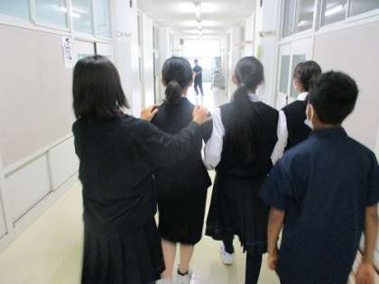 代表生徒が職員室に迎えに行き、目をつぶってもらったまま、暗い音楽室へ。