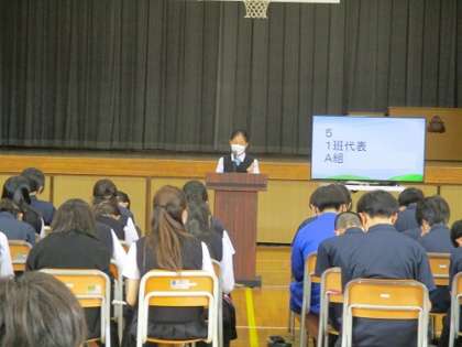 体育館では、1年生の河口湖移動教室の事後学習の一環として、学年スピーチ発表会が開かれました。