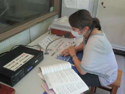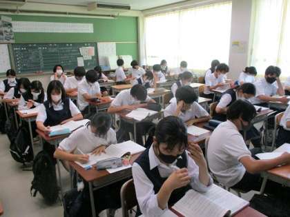 放送室から音楽科の先生が、曲の特徴や、ポイントなどを紹介してから、3クラス一斉に曲を流します。自分たちがステージで歌っている姿を思い浮かべながら、真剣に聴き入っていました。
