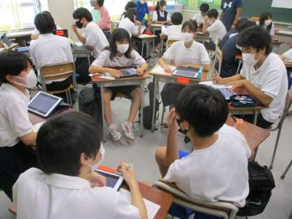 本日5校時に、3A,3B、3Cで研究授業が実施されました。テーマは、「タブレットの効果的な活用」についてです。