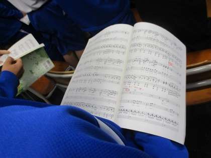 合唱コンクールで歌う課題曲と自由曲の楽譜を見ながら、音取りをしていました。