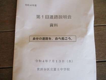進路説明会では、入試の制度や日程、高校見学のポイントについてお配りした冊子に沿ってお話しさせていただきました。ご不明な点がありましたら、遠慮なく担任までご相談ください。