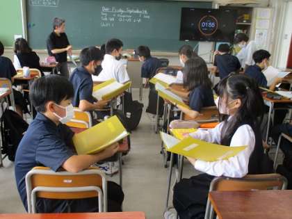 導入の部分では、ミュージカル「アニー」より「Tomorrow」の曲を使って、英語を学んでいました。元気ハツラツの1年A組は、習ったばかりの曲にも関わらず、一生懸命きれいな発音で歌っていました!