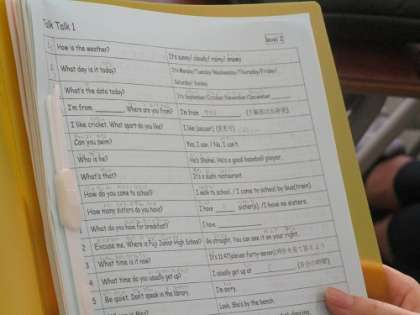 1年C組の教室では、曲の後、ペアワーク「Let's Talk」が行われていました。決められた時間内に、ペアといくつ会話ができるか。みんな楽しんで取り組んでいました。