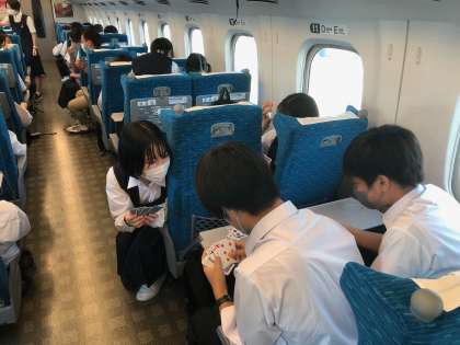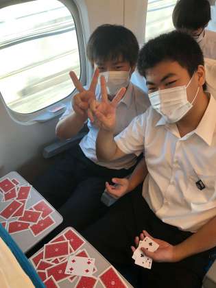 新幹線の車内で、トランプやUN?Oを全力で楽しんでいます。