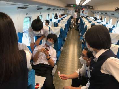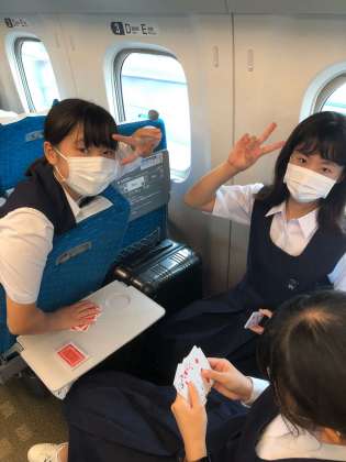 新幹線の中、仲良く盛り上がっています。まもなく下車準備です。10:57に京都駅着予定です。