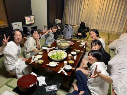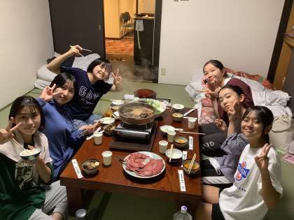 夕食のすき焼きタイムです。美味しいお肉に、みんな笑顔がこぼれます!