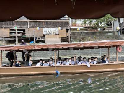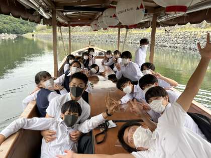 B組、川下り始まりました!過去、琵琶湖の放水などで乗れなかった担任の先生の念願が、かないました。