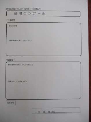 修学旅行の振り返りと同時に、今週から始まる合唱コンクールの取組みについての目標を、キャリアパスポートに記入します。