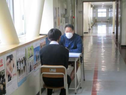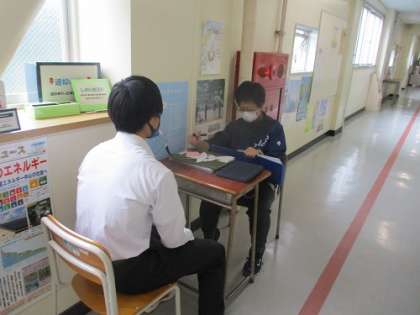 昨日から学活や総合的な学習の時間と並行して、担任との2者面談が行われています。明日から始まる3者教育面談の前に、今のところで考えている志望校の確認や、学校見学をした印象などを聞いています。