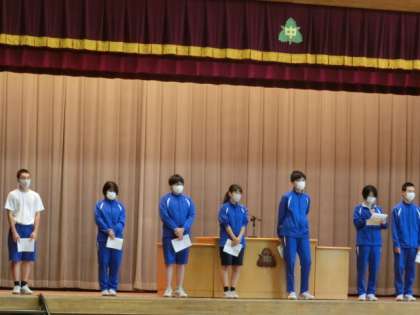 3年生が各運動部で取り組んできた事や、努力して成果につながったものなど1,2年生に今後への想いや考えをメッセージとして伝えました。また、後輩からは、先輩の後を受け継いでいく責任感と感謝の気持ちを伝え、今後の1,2年生の頑張りに期待したいと思います。