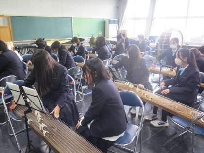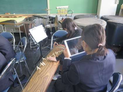今日は1年生の音楽で和楽器「箏」を扱った授業がありました。練習曲は「さくら」。小学校では習っていない、左手を使った技法もあり、「難しい!」という声も聞こえましたが、どのクラスも集中して頑張っていました。iPadも使って、自分の奏法や姿勢を確認しました。一緒に参加したALTの先生からは、「Beautiful!」とお褒めの言葉を頂きました。