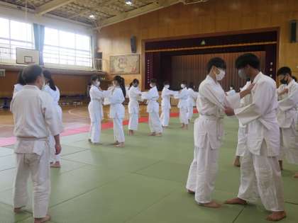 2年生の体育は、1月から柔道に取り組んでいます。お手本として柔道部員が受け身を取りながら先生に投げられる姿には、「おお!」、「すごい!」と、仲間に対する賞賛の声が上がっていました。一つ一つの技に真剣に取り組んでいる姿に、さすがあと少しで3年生だ、と頼もしさを感じることができた時間でした。