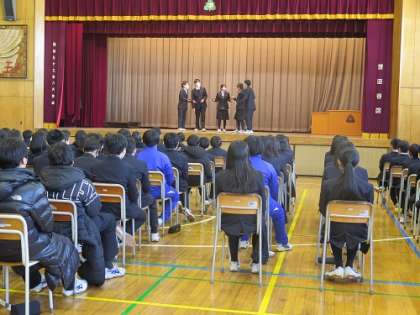 25日の5時間目に、1年生が2月3日の校外学習に向けての学年道徳の授業をしました。各クラスの学級委員が、自分たちで考えた校外学習のルールをどうしたら学年のみんなに守ってもらえるか考え、自らロールプレイングを披露しました。見る側もとても真剣な表情で見守っていました。終わった後も学年全員で意見を共有し、とても有意義な時間となりました。校外学習の大成功を祈ります!