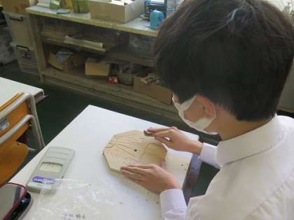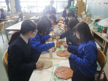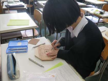 3年生の美術の授業では、木彫の時計を制作中です。テーマは「今の私、未来の私」。集中して掘り進める生徒、やすり掛けを黙々とする生徒、仲間と談笑しながらニス塗りをする生徒、それぞれのペースで作業を進めています。受験真っ只中の3年生ですが、仲間同士で和やかな雰囲気を作りながら、ほっと一息をつくひと時となっています。
