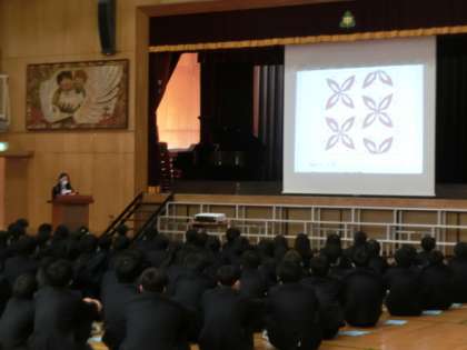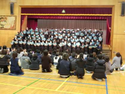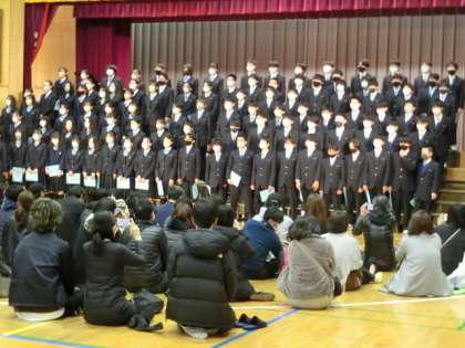 技術家庭科、美術科より各クラスの代表者が作品について工夫点などを発表しました。その後、1学年全員で音楽科の発表ということで「君をのせて」「Let's search tomorrow」「南風」「旅立ちの日に」「校歌」を合唱しました。保護者の方も70名ほどの方が参観してくださり大きな拍手が沸いていました。