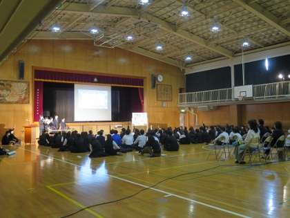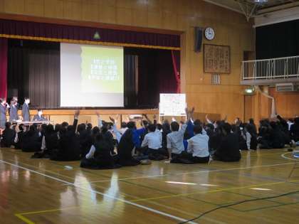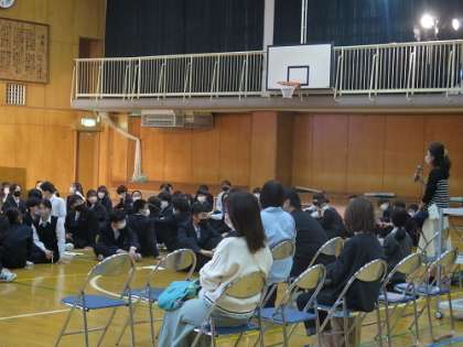 本日の6校時に、1年生の校外学習事後学習の学年発表会がありました。班ごとに模造紙に学習した内容をまとめ、それについての説明を役割分担をして発表していました。学級委員の司会で、各クラスの代表が、それぞれのクイズを織り交ぜながら工夫を凝らした内容を堂々と発表する姿に、この1年間の成長を感じました。聴く側の生徒もそれぞれに真剣に聴き入っていました。最後には保護者の方から、「当日にみんなが楽しみながら学習した様子がよく伝わってきた」とのお褒めの言葉をいただくことができました。