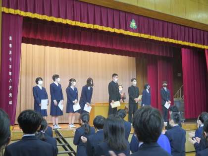 生徒会長の話の後には世田谷区の特別表彰生徒や都展に出品した生徒の表彰がありました。