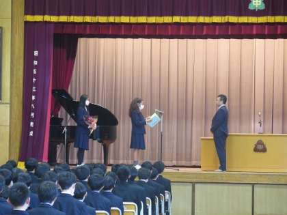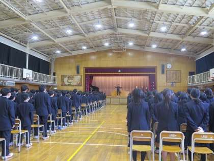 本日の6校時、今年度の離任式が執り行われました。富士中を去られた3名の先生方に列席して頂き、心温まる式となりました。それぞれの先生方の富士中生への想いをしっかりを受け止めていました。校歌斉唱では、入学して一か月も経たない1年生もしっかりと顔をあげて歌っている姿は立派でした。