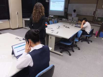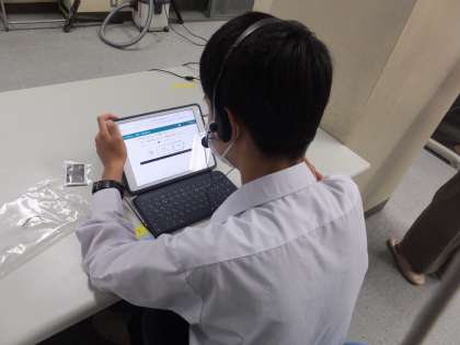 マイク付きヘッドフォンをiPadに繋ぎ、ウェブサイト「L-Gate」にログインし、アプリケーション「MEXCBT」を立ち上げ、自分のログイン番号をQRコードから読み取らせてとテストよりも準備が大変そうな印象でした。
