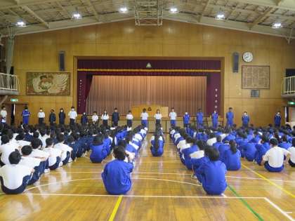 本日は生徒朝礼の日でした。最初に今日から3週間富士中学校で過ごす教育実習生の紹介がありました。