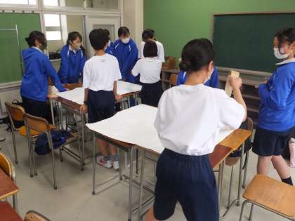 月曜日の放課後は全てのクラスの模造紙係が集まり、展示のためにガムテープでの補強作業と雨除けの透明シート貼りを行いました。