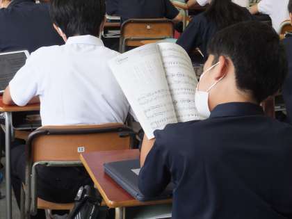 6時間目に合唱コンクールの自由曲決めが行われました。候補曲を順番に放送で聴き、自分が感じたことをプリントに書き込みます。限られた時間で合唱曲集とiPadで楽譜や歌詞を確認しながらクラスの自由曲としてふさわしいと思うものをそれぞれ選択しました。