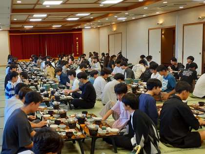 修学旅行2日目。起床し、部屋の片付けを済ましてからの朝食。どの班も片付けをスムーズに済まして幸先よい朝です。予定通り行程が進んでいます。