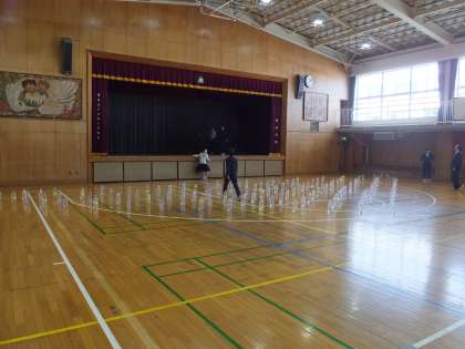 体育館に2Lペットボトルのピン約100本が用意され、クラスで40球投げ(1人1投以上)、倒れた合計を競い合います。