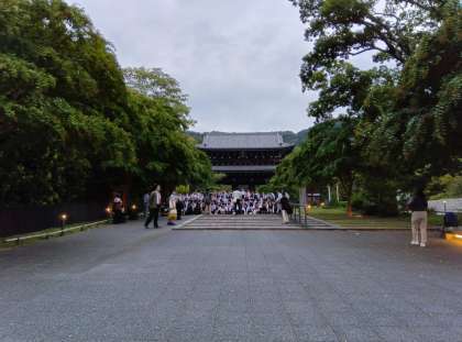 奈良から京都へともどり、知恩院前で、学年写真撮影です。奈良班行動でお疲れ気味でしたが、笑顔で撮影できました。これから宿で楽しい夕食です。