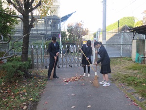 学校の敷地内の落ち葉はきを総勢50人以上でやりました。掃いても掃いても無くならない落ち葉に苦戦しつつも、掃除がお終わった後には「きれい!気持ちいい!」と歓声が上がっていました。気持ちの良い一日のスタートが切れそうです!