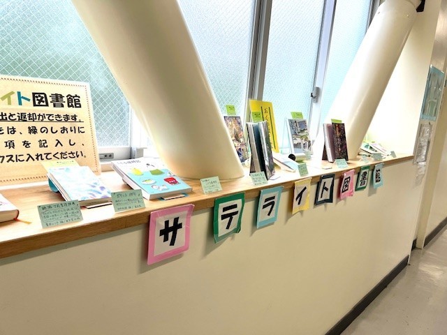 本校の図書司書さんと図書委員会が、職員室前の廊下に「サテライト図書館」を設置しています。