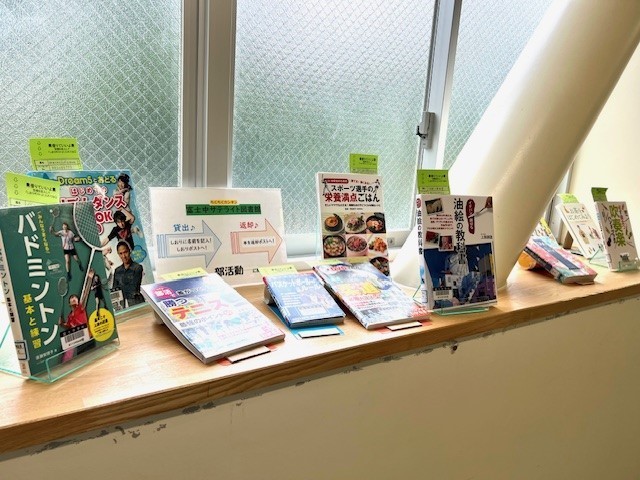 毎回、工夫を凝らした選書とディスプレイをしています。今回は、部活動関係の本と、奥の細道関係