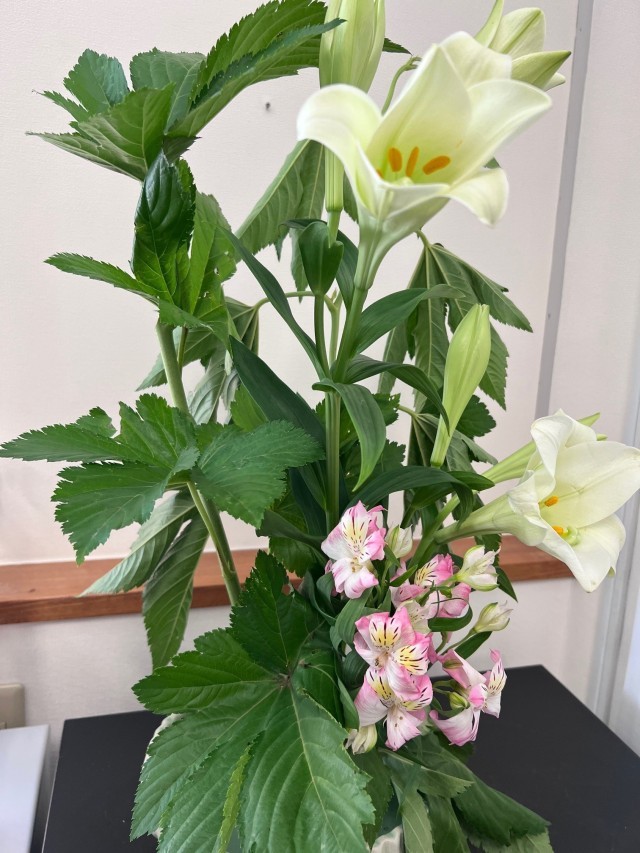 2番目の写真は、先日華道部が生けた作品です。キイチゴの大きな葉が白いユリを引き立てています。