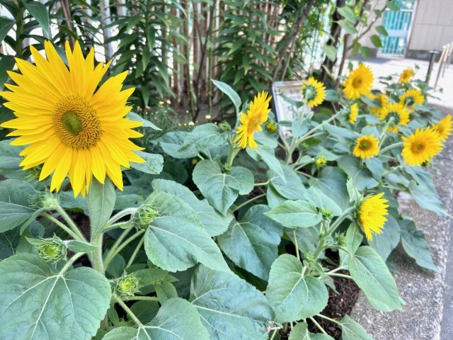 3番目の写真は校門の朝顔。主事さんたちがあちこちに2種類の朝顔を植えています。