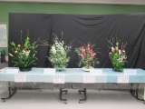 日本文化部で華道を学んだ生徒たちの作品が、集会室に展示されています。来校者が最...