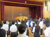 生徒朝礼を体育館で行いました。生徒会本部役員と保健委員からの話、教育実習生の紹...