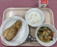 献立は、・ごはん・魚のチーズ包み揚げ・和風サラダ・豚汁・牛乳です。魚のチーズ包み揚げは、名前の通り春巻きの皮で下味をつけたさばとチーズを包んで揚げています。魚が苦手な人にもおすすめな料理ですが、食べて...